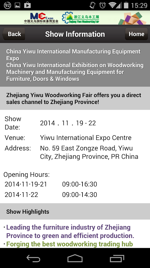 With this comprehensive mobile application, you can conveniently access all information on Zhejiang Yiwu Woodworking Fair 2014, including: