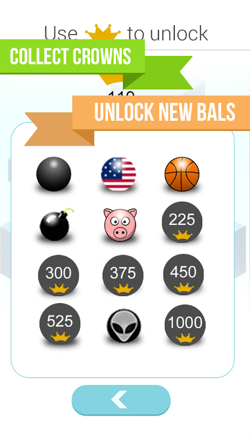 Tap on the screen to make it go left or right while collecting the crowns along the way to buy new balls. You can choose from 12 different balls to play with an unlock (Basketball, Bomb, USA Flag Ball, Earth Ball, Pig Ball, Halloween Pumpkin Ball, Soccer Ball, Smiley Face Ball and Pink Candy Ball). A lot more balls will be available in the following updates.