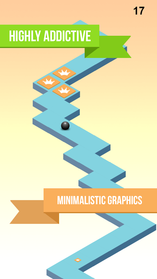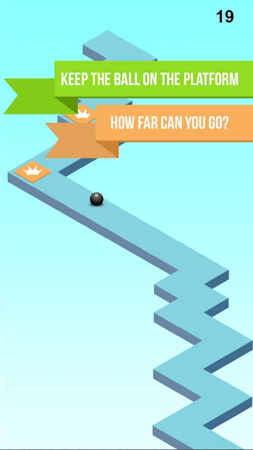 Each time you zigzag, you can collect crowns by staying on the ledges of the platform. Use your agility and quickness to switch the direction of the ball in order to score points and beat your friends. In a future update a Multiplayer Ball will be added where you can race your friends by doing zig zags in the same game and see who can stay the longest alive.