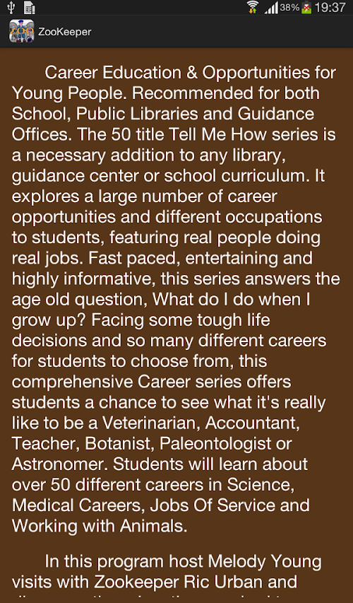In this app host Melody Young visits with Zookeeper Ric Urban and discovers the education required to care for animals and the role of zoos in preserving endangered species. Subjects Covered Include: What does a zookeeper do? How do you get started as a zookeeper? Do you have to go to college to be a zookeeper? What courses are important to be a zookeeper? Different types of zookeepers. Where do zoos get their animals? Is math important to being a zookeeper? What are endangered animals? Why is it important to have zoos? Why is it important to feed animals a proper diet?