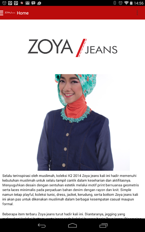 Selalu terinspirasi oleh muslimah, koleksi Zoya jeans kali ini hadir memenuhi kebutuhan muslimah untuk selalu tampil cantik dalam keseharian dan aktifitasnya. Menyuguhkan desain dengan sentuhan estetik melalui motif print bernuansa geometris serta laces minimalis pada perpaduan bahan denim dengan rayon dan knit. Simple namun tetap playful, koleksi tunic, dress, jacket, kerudung, serta bottom Zoya jeans kali ini akan pas untuk dikenakan muslimah dalam berbagai kesempatan casual maupun formal.