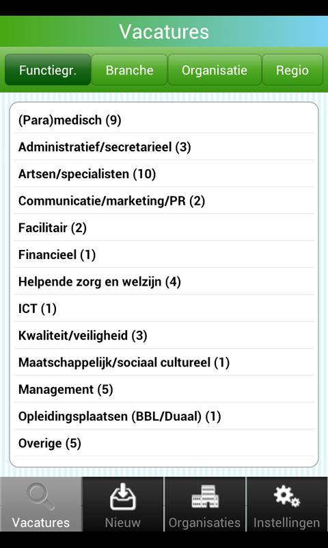 - Vacatures zoeken en filteren op functiegroep, branche, organisatie of regio;